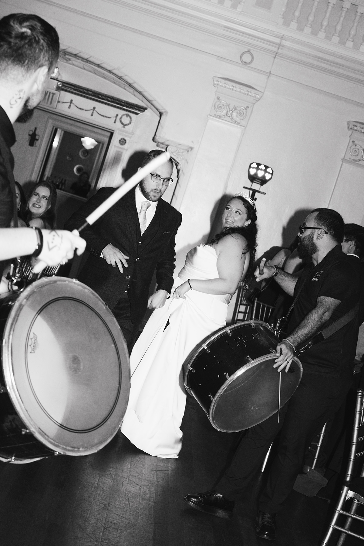 an energetic party of a wedding at a speakeasy mansion //